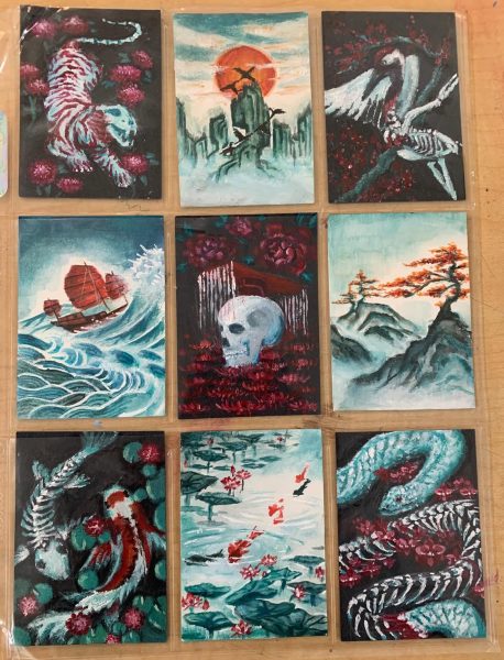 From his pieces that he has completed so far, the consensual favorite are his trading cards made for the AP art class.